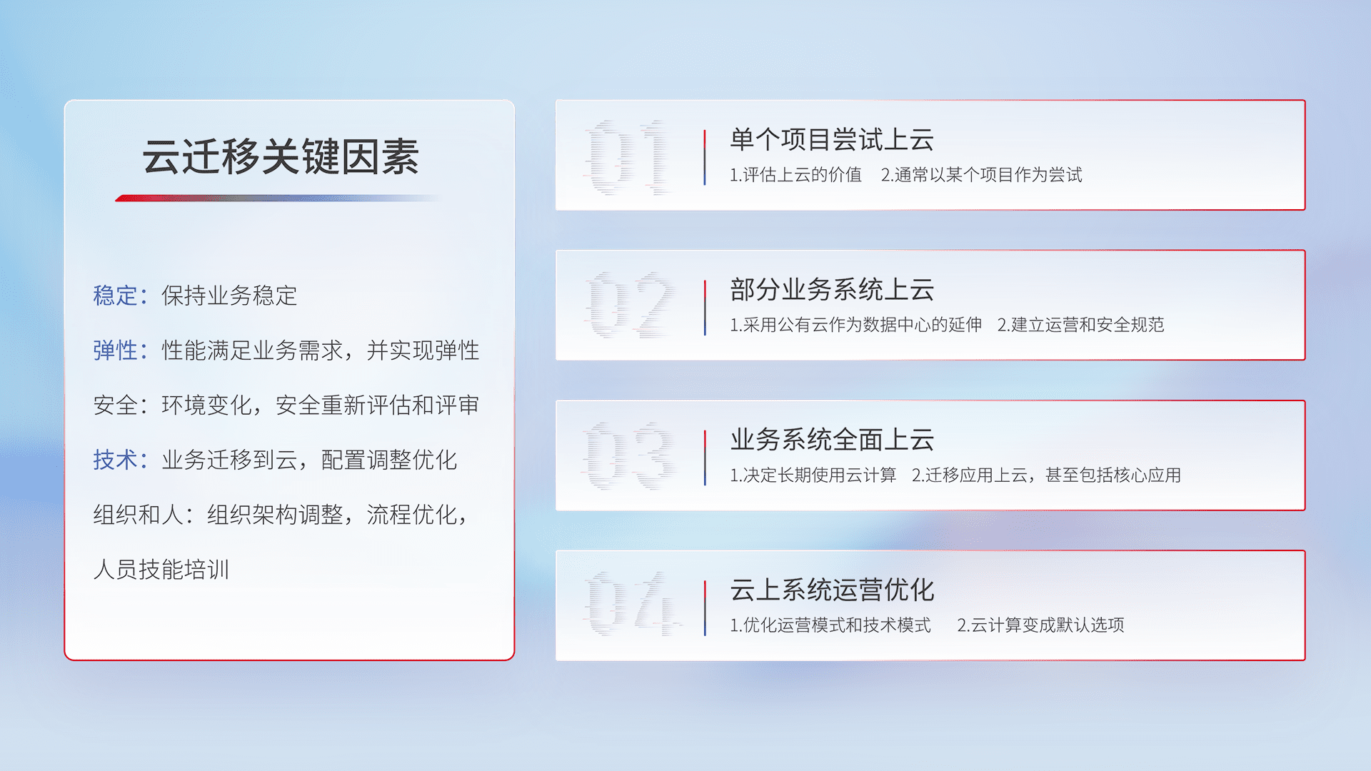 结合实际业务,,从规划设计、、云平台选型、、、云原生改造、、数据迁移、、集成交付,,,迁移全过程为客户识别最佳上云路径,,,,做好风险识别管理,,,,设计网络架构、、、身份权限、、、安全审计合规、、、操作审计、、、、日志审计、、、监控告警策略、、多站点容灾设计等,,对云上基础设施进行整体规划,,,,提升IT治理水平,,,以满足弹性、、、高可用、、、、高性能的需求。。。。