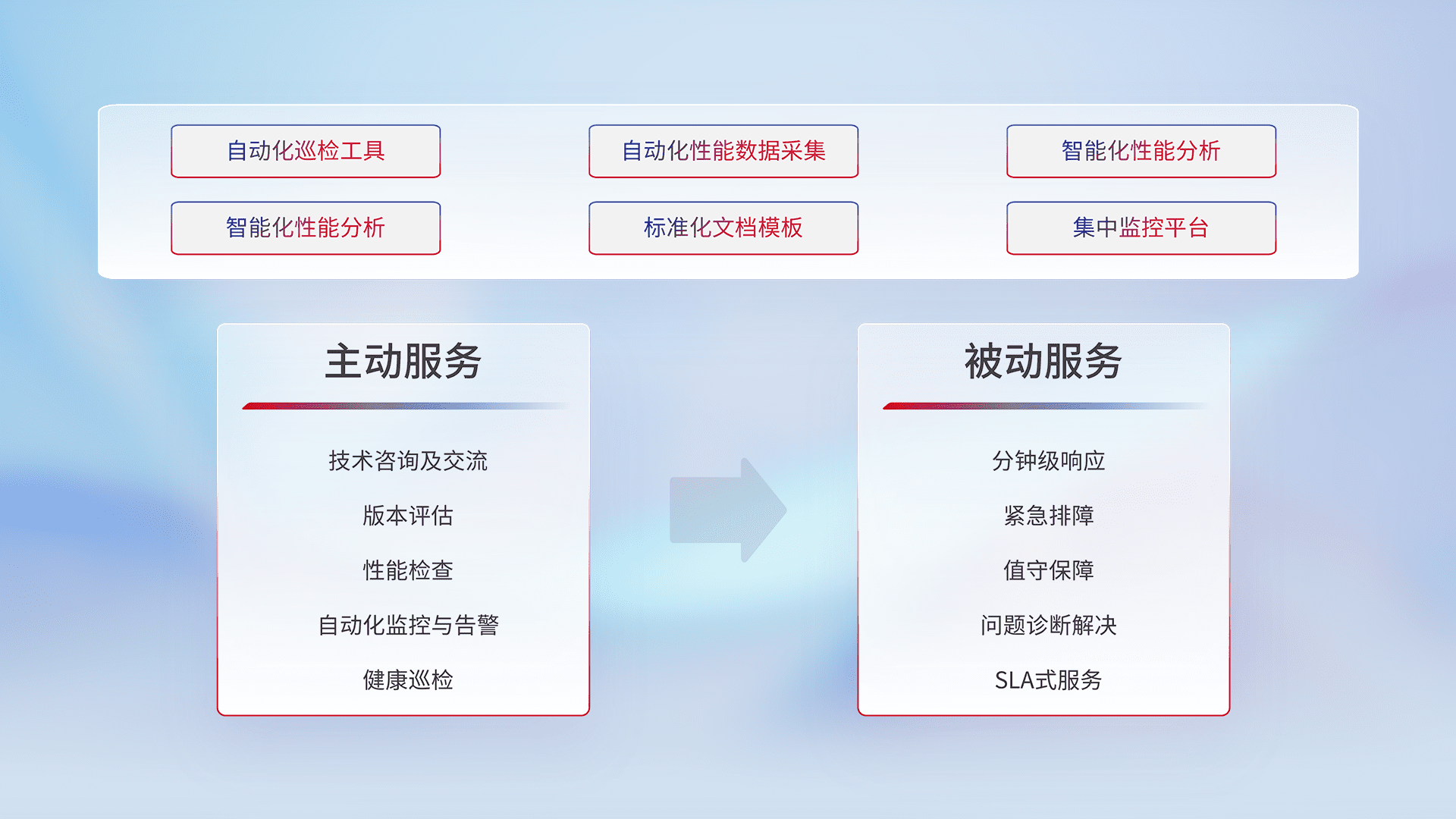 智能化工具和标准化文档,,,,保障服务质量,,,提供主动服务(包含技术咨询、、、版本评估、、、、性能检查、、自动化监控与告警、、、、健康巡检)和被动服务包含(分钟级响应、、、、紧急排障、、、、值守保障、、问题诊断解决、、SLA服务)。。。。