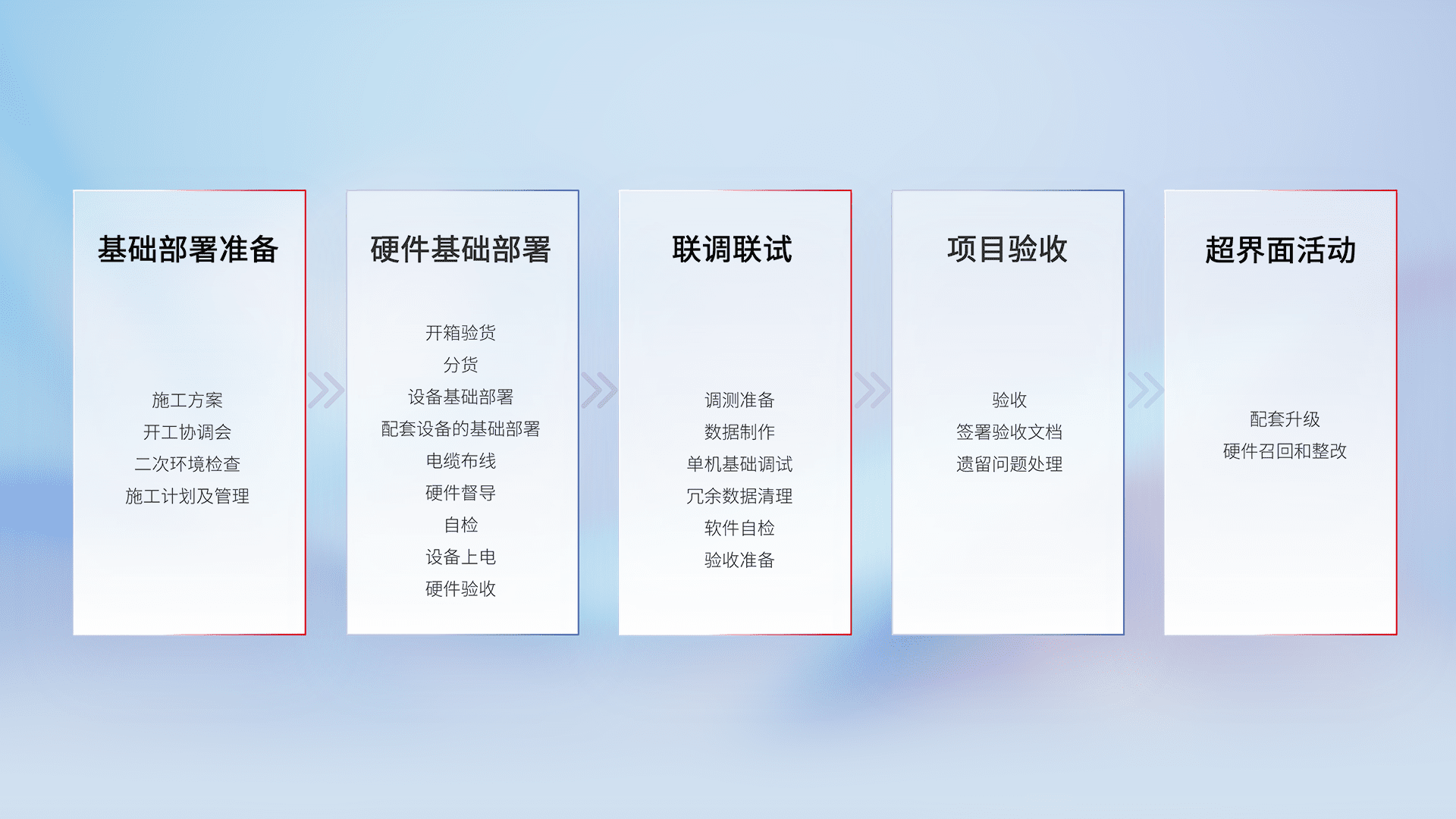 从基础部署准备、、、硬件基础部署、、联调联试、、项目验收、、越界面活动的全过程可追溯,,保证施工质量和进度。。
